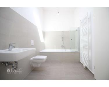 Das Badezimmer mit Badewanne ist zeitlos hell gefliest. Zusätzlich gibt es ein Gäste-WC für Besucher.