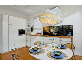 Die bodentiefen Fenster sorgen in der Wohnküche für eine natürliche und angenehme Belichtung. Die Wohnküche ist ausgestattet mit einer hochwertigen deutschen Markeneinbauküche von LEICHT. Sie hat weiße Fronten und eine Arbeitsplatte in Holzoptik. Die Einbauküche verfügt über Einbauschränke (Ober- und Unterschränke), Markenküchengeräten von Bosch/Siemens, Spülmaschine, Ofen, Herd etc.