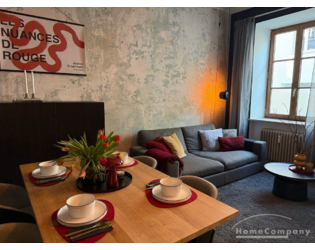 Das helle Wohnzimmer ist hochwertig eingerichtet mit einem komfortablen Sofa, einem Tisch mit Stühlen sowie einem Smart TV und lädt sowohl zum Entspannen als auch zum Arbeiten ein. Das stilvolle Einrichtungskonzept wird durch ein Hue-Lichtsystem ergänzt, das in mehreren Räumen für individuell anpassbare Lichtstimmungen sorgt. Das ruhig gelegene Schlafzimmer ist mit einem Bett in der Größe 160 × 200 cm sowie geräumigen Schränken ausgestattet und bietet viel Stauraum und eine angenehme Rückzugsmöglichkeit. Auch hier unterstreicht die geschmackvolle Möblierung den hochwertigen Gesamtcharakter der Wohnung.