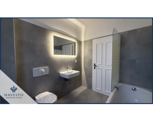 Das Badezimmer präsentiert sich ebenfalls in neuem Glanz und ist mit einer Badewanne, neuen Armaturen, neuer Keramik sowie einem modernen LED-Spiegel ausgestattet.
