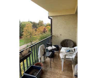 Der überdachte Balkon ist mit Holzbodenbelag versehen und sowohl vom Wohnzimmer als auch vom Schlafzimmer aus begehbar.