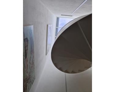 Ein architektonisches Highlight bildet die Design-Treppe aus weiß lackiertem Stahl mit Holzstufen – ein echtes Statement und zugleich funktionaler Blickfang.