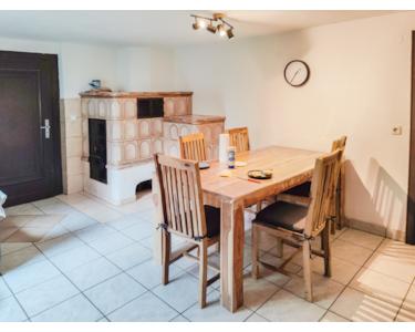 Die Beheizung erfolgt über einen großen wassergeführten Kachelofen im Esszimmer. Das Warmwasser wird über Durchlauferhitzer erzeugt.