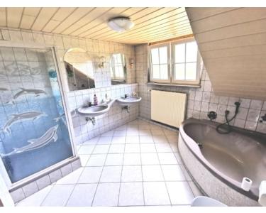 1 großes Tageslichtbad mit Eckbadewanne, Dusche, WC, Doppel-WB im OG
