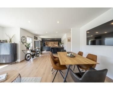 im Erdgeschoss einen behaglichen Wohn-/Ess- und Kochbereich, der über 4 Terrassentüren