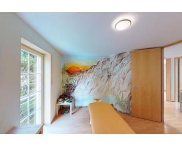 Insgesamt stehen sieben Räume zur Verfügung: ein Wohn- und Essbereich sowie sechs weitere, separat angeordnete Räume. Diese wurden bisher unter anderem als Büro, Massagezimmer, Ankleide, Schlafzimmer und Hauswirtschaftsraum genutzt.