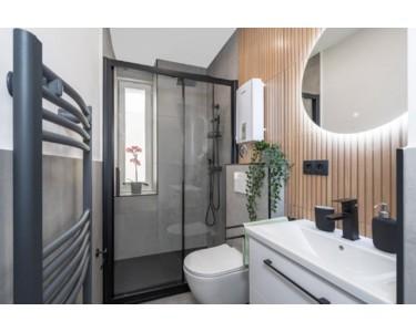 Edles Bad mit Holzpaneelen, Sp