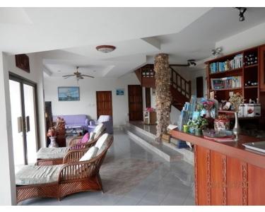 Das Haus aus dem Baujahr 1995 mit ca. 300 m² Wohnfläche öffnet sich mit seiner Breitseite zum Meer. Diese komplett verglaste Hausfront gibt den Blick frei über Palmen auf Baum - und Grünflächen und auf das unterhalb liegende Meer - den Golf von Siam. Das Objekt ist in den Hang gebaut, so dass die unterschiedlichen Ebenen bequem erreichbar sind. Vom Straßenniveau betreten Sie das Erdgeschoss mit ca. 40 m² Außenterrasse, die man als Terrassenrestaurant mit Außenküche übernehmen kann. Diese Ebene verfügt zudem über einen. Carpark, mit PKW - Stellplatz. Von der Terrasse erreichen Sie das Kellergeschoss mit Nutz - und Technikräumen und einem Mitarbeiterzimmer. Das Erdgeschoss ist innerhalb des Hauses Kommunikationszentrum mit Rezeption, Einbauküche, Essbereich, Bar, Lesebereich, Lounge, Gäste - WC und zwei großen Räumen zzgl. Privatbad für die Eigentümer. Eine Naturholztreppe führt in das Obergeschoss mit drei Apartments, einem sg. Maidzimmer, und einem Abstellraum. Alle Apartments haben eigene Bäder mit Dusche oder Wanne und Balkone mit Aussicht auf das Meer. Die Einrichtung ist vollständig mit einem Doppelbett, Schrank, Sitzecke, Kühlschrank, etc. Die Etage ist komplett mit Klimaanlage versorgt.