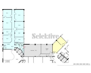 Die Raumtrennung erfolgt durch Leichtbauwände. In den abgehängten Decken befinden sich Rastereinbauleuchten.