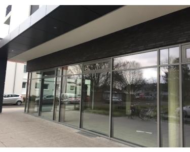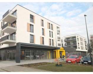 Die fast quadratische Gewerbefläche befindet sich in werbewirksamer Ecklage im Erdgeschoss eines architektonisch reizvollen und energieeffizienten Neubaus mit einem Lebensmitteldiscounter, Hausverwaltungsbüro und familiengerechten Wohnungen in den oberen Etagen. Bis auf die angebotene Fläche sind alle Einheiten vermietet. Der vorgelagerte Parkplatz ermöglicht gute Sicht auf die großzügigen Schaufenster insges. ca. 20 lfdm zur Präsentation.