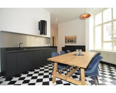 verfügt über hochwertige Elektrogeräte von Bosch/Siemens und Miele, eine moderne Dunstabzugshaube und einen großen Holztisch welcher Platz für mindestens sechs Personen bietet. Die großen Fenster in der Küche bieten genügend Lüftungsmöglichkeiten.