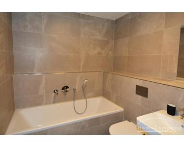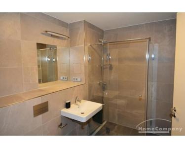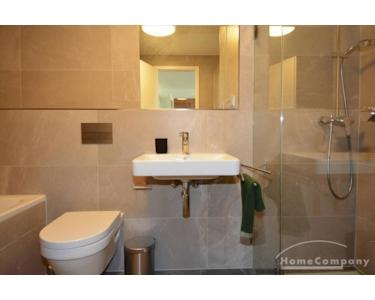 Modern gefliestes Badezimmer mit Dusche und Wanne. Wohnung verfügt überall über Parkett und eine Fußbodenheizung.