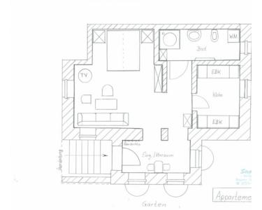 Das Appartement ist insgesamt ca. 45 m² groß und teilt sich in einen Eingangsbereich mit Garderobe und Sitzmöglichkeit, großen Wohn- und Schlafraum sowie eine Küche mit EBK und Bad mit Dusche, Waschbecken, WC und Waschmaschine auf.