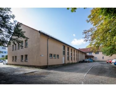 Das bisher von einem Bildungsträger genutze Objekt gliedert sich in drei Gebäudeteile. Der nördliche Gebäudeteil bietet ca. 1.023 m² Produktions- und Werkstattfläche mit einer rückwärtigen Anfahrt. An der Giebelseite des Gebäudes befinden sich im Erdgeschoss und Obergeschoss Büro- und Schulungsräume von ca. 130 m². Im mittleren Gebäudeteil sind im Keller Werkstattflächen sowie Sozialräume zu finden. Die Fachunterrichtsräume im Erdgeschoss könnten als Besprechnungs- oder Büroräume genutzt werden. Das Obergeschoss bietet weitere Büroflächen von ca. 390 m². Der südliche Gebäudeteil bietet neben einer Kantine weitere Werkstatt- und Büroräume.