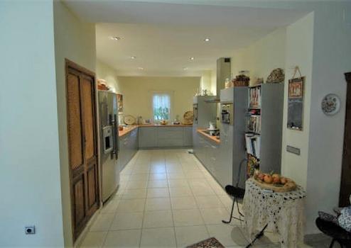 Das Ambiente im Haus modern und komfortabel steht in sichtbarem Kontrast zu den kleinen verspielten Türmchen und Zinnen des Äußeren. Helle Fliesen geben ein angenehmes Gefühl, welches sich in der eindrucksvollen, modernen Küche mit Vorratsraum, dem lichtdurchfluteten Esszimmer und dem großzügigen Wohnraum mit modernem Kamin fortsetzt. Eine kleine Bibliothek lädt zum Schmökern ein. Im Herrenzimmer mit großem Kamin und alten Fliesen lädt der Burgherr die Gäste zum gepflegten Drink.