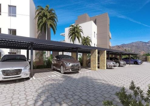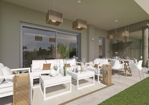 Alle Appartments bieten weitläufige Terrassen mit Glasgeländer und atemberaubendem Blick auf den Golfplatz. Zu den Erdgeschosswohnungen gehört ein eigener Gartenabschnitt mit Blick auf den Gemeinschaftspool, die Gartenanlagen des Resorts und den Golfplatz, der die Wohnanlage umgibt.