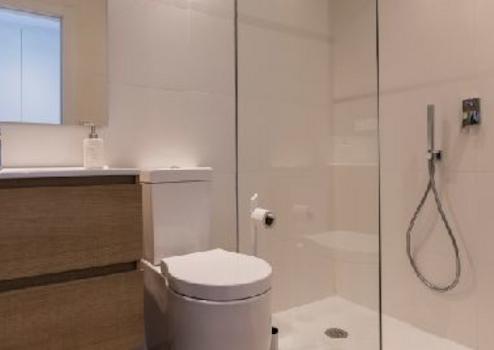 - Zweites Badezimmer mit hochwertigem WC, weiße Acryl-Dusche mit Duschwand installiert,