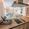 - In den Wohnbereich integrierte Küchen in Dreibettappartements mit einer Koch-Insel aus Acryl