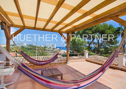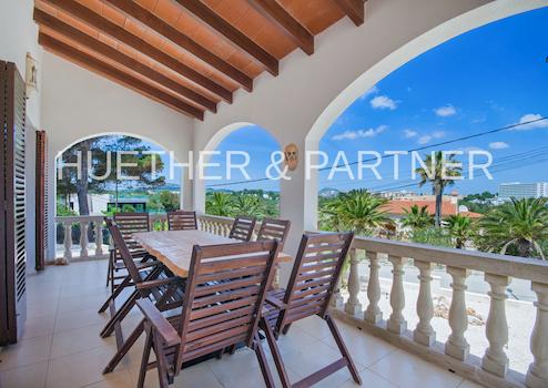 Schöner Blick über die Bucht der 2 Sandstrände von Calas Mallorca von der chilligen Dachterrasse.
