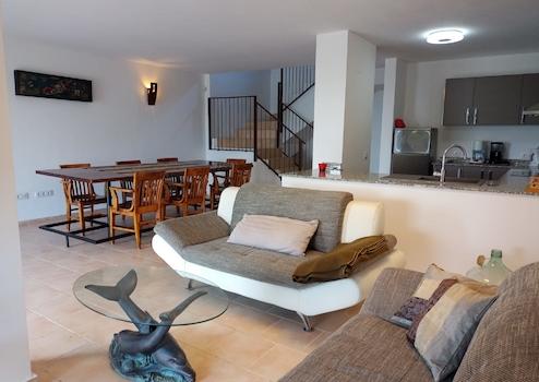 Erdgeschoss mit voll ausgestatteter Küche, Tisch mit 8 Stühlen, Schlafcouch, Fernseher, Gartenmöbel.