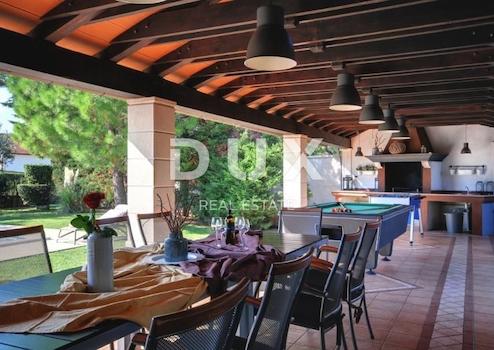 MODERNES HAUS MIT POOL (EG + 1) zu verkaufen in Veli Vrh (Pula). Es besteht aus 5 Schlafzimmern, drei Badezimmern und einer Toilette. Erdgeschoss: WC, Badezimmer, ein Schlafzimmer, Küche, Esszimmer und Wohnzimmer mit Zugang zu einer überdachten Terrasse mit Blick auf den Garten und den Pool. Auf der überdachten Terrasse gibt es Billard, Tischfußball, Darts, Esstisch für 12 Personen und Grill. Das Esszimmer und das Wohnzimmer sind offener Raum. Im Außenbereich befindet sich ein Kinderspielplatz. 1. Stock: 2 Bäder, 2 überdachte Terrassen, 4 Schlafzimmer (zwei mit Zugang zur Terrasse) Parkplatz: ein überdachter Außenstellplatz und 4 nicht überdachte Stellplätze im Hof. Auch die Möglichkeit, die Straße innerhalb der Siedlung für zusätzliches Parken zu nutzen. Neben dem auf den Bildern befindlichen Gebäude gibt es einen Keller von 30 m2, eine Taverne mit Kamin und Toilette, eine Wohnung mit einem Badezimmer, einem Schlafzimmer und einem Wohnzimmer. Diese Wohnung hat Zugang zu einem Außenbereich von 200 m2. Das gesamte Grundstück ist eingezäunt, was Freiheit und Privatsphäre bietet. Nur 2,5 km von wunderschönen Landschaftsstränden sowie wilden unberührten Stränden umgeben von mediterranen Pflanzen und Vegetation. Das römische Amphitheater ist nur 2,5 km entfernt, ebenso das Zentrum von Pula mit allen notwendigen Einrichtungen für das Leben eines modernen Menschen. Eigentumsnachweis ohne Belastungen! Nutzungserlaubnis!