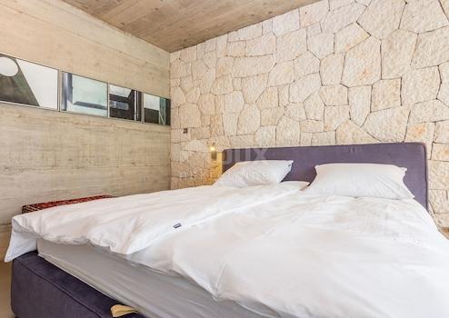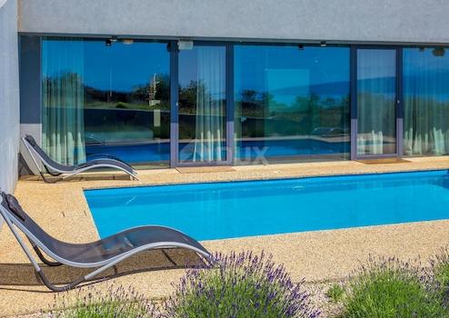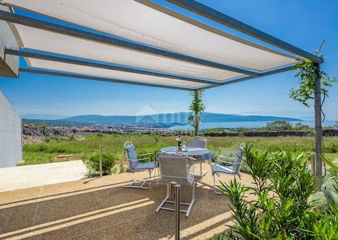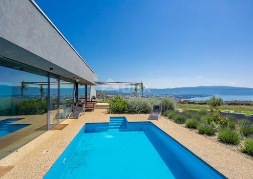 Krk, freistehendes Passivhaus - energieunabhängig, mit Panoramablick auf die Stadt Krk. Es befindet sich auf einem 30.000 m2 großen Grundstück, umgeben von Olivenhainen mit Bewässerungssystem. Die Villa ist einzigartig und fügt sich in das Ambiente gut ein. Es besteht aus zwei großen Schlafzimmern, von denen eines über einen Arbeitsbereich, ein Wohnzimmer mit Küche und Essbereich, einen Flur, einen Abstellraum, ein Bad und eine Toilette verfügt. Im Haus wurde Ein System zur Aufrechterhaltung der Lufttemperatur, Luftfeuchtigkeit und zur Regulierung der Luftreinigung und des Luftaustauschs installiert. Vor dem Haus befindet sich eine Terrasse mit Blick auf das Meer und den Pool. Der Parkplatz befindet sich auf dem Dach. Das Haus wird mit Hilfe eines Dieselgenerators von Photovoltaik-Modulen angetrieben. Außerdem wurde auf dem Grundstück eine Baugenehmigung für den Bau eines weiteren Gebäudes von 80 m2 erteilt.