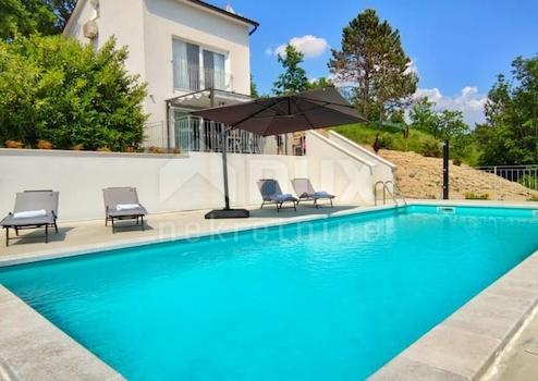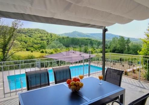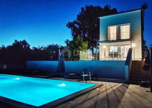 In Zentralistrien, auf einem Hügel, liegt diese schöne moderne Villa mit Pool. Im weitläufigen Garten gibt es einen Swimmingpool, Grill, überdachte Terrasse mit Tisch und mehrere Parkplätze. Die Villa besteht aus zwei klimatisierten Etagen und einem Dachboden. Neben einer Klimaanlage gibt es auch eine elektrische Fußbodenheizung. Das Erdgeschoss verfügt über ein Badezimmer, eine ausgestattete Küche mit Essbereich, ein Wohnzimmer mit modernen Möbeln und Zugang zur Terrasse. Im ersten Stock gibt es ein Schlafzimmer und ein Badezimmer. Im Dachgeschoss des Hauses befindet sich ein weiteres Schlafzimmer. Die Villa liegt in Alleinlage mit schöner Aussicht und ist durch die Nähe zur Stadt Pazin für das Familienleben geeignet, aber auch zu vermieten. Sie werden die wunderschöne unberührte Natur im Herzen Istriens genießen.