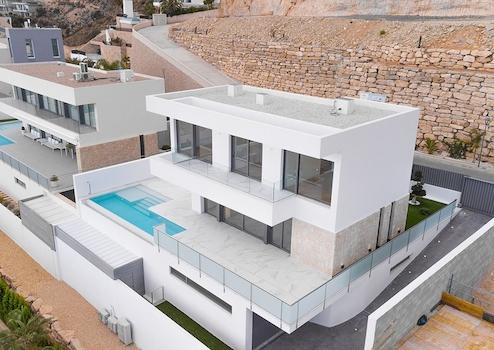 Diese kleine Wohnanlage besteht aus nur 5 Luxusvillen im minimalistischen Stil mit weitem Blick auf das Meer und die Stadt Benidorm. Sie bestehen aus Untergeschoss, Erdgeschoss und Obergeschoss, bieten eine exklusive Ausstattung und hochwertige Materialien und überzeugen durch ihre Großzügigkeit, ihr elegantes Design, die helle und lichtdurchflutete Gestaltung der Innenräume und die großzügigen Terrassen und Gärten.