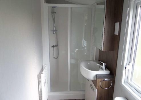 Badezimmer mit Dusche, Waschbecken und Toilette.