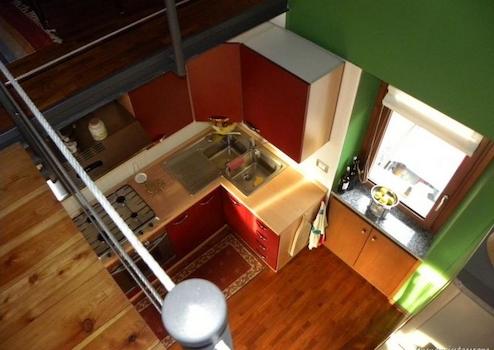 upper floor and underrof - spacey living room with build in kitchen, balcony, open space to the galery with its bridge crossing the house end ending in the bedroom, seperate bathroom