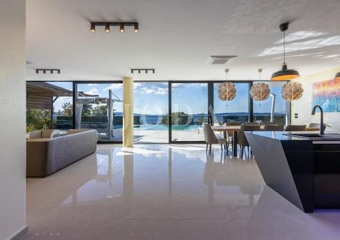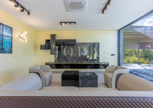 Das Erdgeschoss des Hauses mit einem Schlafzimmer und einem Badezimmer stellt das Wohnzimmer mit Küche und Esszimmer interpoliert mit dem Äußeren des Hauses dar. Ganz nach dem Konzept des offenen Raums.Große verschiebbare Wandwände lassen den Innen- und Außenraum zu einem Ganzen werden.