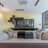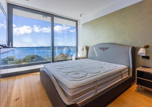 Die Treppe führt in den ersten Stock, wo sich drei Schlafzimmer mit jeweils eigenem Bad und Balkon befinden, während sich im obersten Stockwerk eine Dachterrasse mit Sonnendeck und Whirlpool befindet.