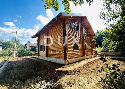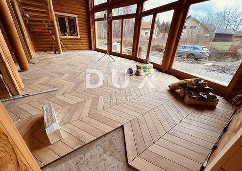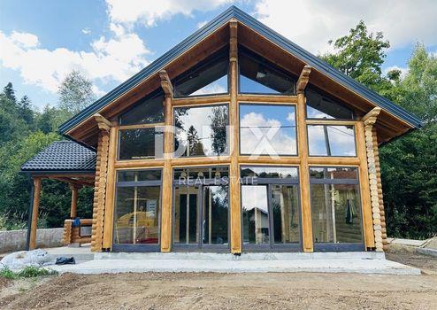GORSKI KOTAR, FUŽINE - neues Haus, 113 m2, gebaut auf einem Baugrundstück von 418 m2. Das Haus ist aus bearbeiteten Baumstämmen / Formen gebaut, Durchmesser 23 cm. Das Hotel liegt am gewünschten Ort in Fužine in der Nähe der Seen Bajer und Lepenica. Das Haus besteht aus einem hohen Erdgeschoss und einem hohen Dachgeschoss. Das Erdgeschoss verfügt über ein Wohnzimmer, Küche, Esszimmer, Schlafzimmer, Badezimmer mit Sauna, zwei Terrassen (eine vom Wohnzimmer / Esszimmer, die andere Terrasse mit Whirlpool mit Ausgang aus dem Badezimmer). Im Dachgeschoss / Galerie - Diele, 2 Schlafzimmer, WC. Die gesamte Vorderseite des Hauses ist komplett in Glaswänden, 7,5 m hoch.