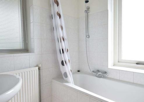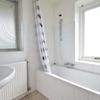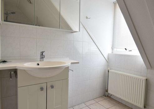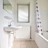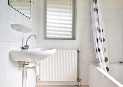 Dieses Badezimmer ist dem Schlafzimmer im Erdgeschoss angegliedert. Das Badezimmer hat ein Waschbecken, einen Spiegel, ein Regal, eine Badewanne und einen Heizkörper. Das Bad ist ca. 1,80 m hoch gefliest und das vorhandene Fenster sorgt für reichlich Tageslicht und Belüftung dieses Raumes.