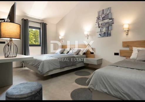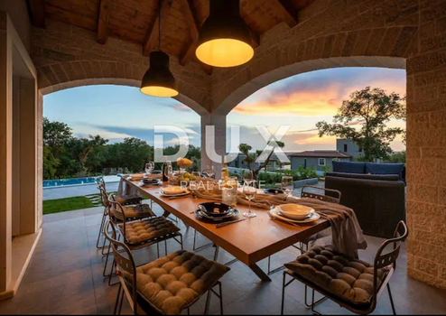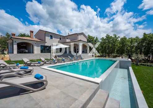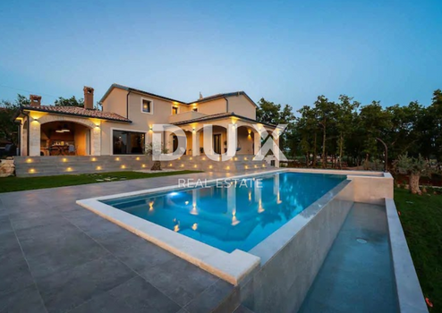Nicht weit von Vižinada entfernt befindet sich diese luxuriöse, moderne und rustikale Villa, die 2020 erbaut wurde und sich auf einem privaten Grundstück von 1600 Quadratmetern mit wunderschönem Panoramablick auf das Meer befindet. Die Villa liegt an einem ruhigen Ort, umgeben von Wäldern und Feldern. In der Nähe befinden sich zwei weitere Ferienhäuser. Das nächste Geschäft ist ca. 3 km entfernt, die Wein- und Olivenölstraße ist nur 500 m vom Haus entfernt und das Meer ca. 15 km. Auf einem großen, vollständig eingezäunten Grundstück bietet die Villa einen 54 m2 großen Infinity-Pool, eine Sommerküche mit Grillkamin und Esstisch, eine Sitzecke, einen Badminton-/Volleyballplatz, ein Trampolin und Schaukeln für die Kleinen. Ferienhaus für 9 Personen von 280 m2 erstreckt sich über zwei vollklimatisierte Etagen. Im Erdgeschoss befinden sich ein geräumiges Wohnzimmer mit voll ausgestatteter Küche, Esstisch und Sitzecke, Doppelzimmer mit SAT-TV und eigener Dusche/WC sowie eine weitere Dusche/WC. Im ersten Stock befinden sich insgesamt drei Schlafzimmer mit jeweils eigener Dusche/WC, Klimaanlage und SAT-TV, zwei davon mit Doppelbett und eines mit einem Doppelbett und einem Einzelbett. Die Villa hat auch einen Keller mit einer Fläche von 350 m2. Diese schöne Villa ist eine tolle Einkaufsmöglichkeit für alle Liebhaber der Ruhe, die ihre Privatsphäre wünschen.