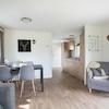 Das Wohnzimmer ist geräumig mit hellen Wänden und Decken. Auf dem Boden liegt schönes Laminat mit Holzmaserung. Durch die großen Fenster und Schiebetüren fällt viel Tageslicht in den Raum. Das Zimmer verfügt über eine Zentralheizung für eine angenehme Wärme. Der Raum ist vollständig mit Doppelverglasung in den Fenstern isoliert, sodass Sie ihn sowohl im Sommer als auch im Winter genießen können.