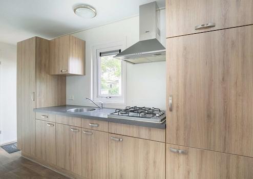 Die Küche ist in offener Verbindung mit dem Wohnzimmer, was sehr angenehm ist. Sie bleiben mit Ihrer Party in Kontakt, wenn Sie einen Snack zubereiten. Die natürliche Farbe des Holzes fügt sich in die natürliche Umgebung ein. Die Farbe der Arbeitsplatte ist hellgrau, was einen schönen Kontrast zum Holz bildet.
