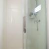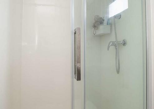 Das Duschbad ist mit einer Glastür abgeschirmt, damit beim Duschen nicht alles nass wird.
