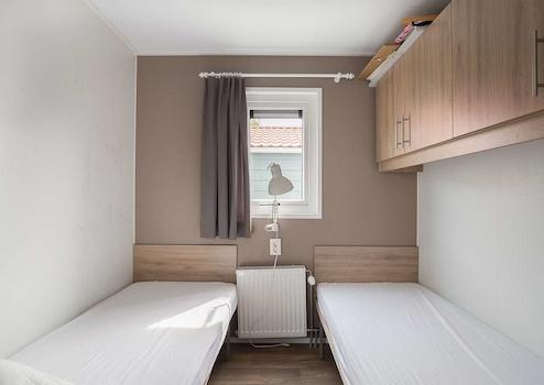 Ein geräumiges Schlafzimmer mit 2 Einzelbetten. Das Zimmer bietet viel Stauraum durch Einbauschränke mit drei Türen über dem Bett. Ideal zum Aufbewahren Ihrer Kleidung.