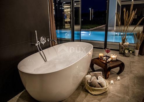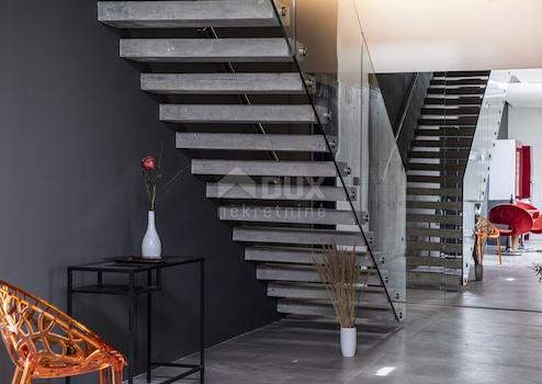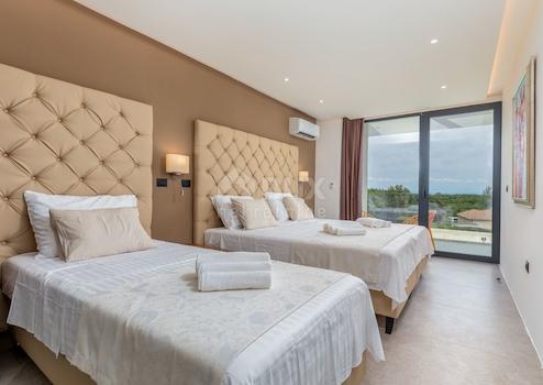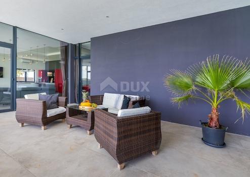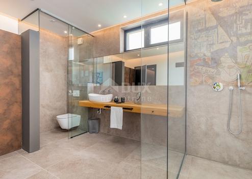 Diese brandneue Ferienvilla befindet sich in dieser Lage nur 600m vom ersten Strand entfernt. Es ist eine moderne architektonische Attraktion und eines der schönsten Häuser in Istrien, das von den renommiertesten kroatischen Zeitschriften gelobt wird. Mit seiner schönen Aussicht auf das Meer und die Inseln Cres und Lošinj wird es Sie mit seinem Innen- und Außendesign sowie der Qualität seiner Verarbeitung sicherlich verzaubern. Auf 328 m² Wohnfläche, die auf zwei Etagen aufgeteilt ist, können Sie alle Annehmlichkeiten dieser Villa genießen. So befindet sich im Erdgeschoss in einem größeren offenen Raum ein schönes und modernes Wohnzimmer, das durch eine größere Glaswand von Tageslicht beleuchtet wird. Sie können die köstlichsten Köstlichkeiten in einer modernen Küche zubereiten, die mit einer Technik ausgestattet ist, die von den besten Künstlern und Designern der Welt unterzeichnet wurde. Die gleichen Köstlichkeiten können Sie mit Familie und Freunden im Esszimmer genießen, das den Wohnraum von der Küche trennt. Außerdem befindet sich im Erdgeschoss eines der Schlafzimmer mit eigenem Bad und Ausgang zum Hof sowie ein separates Gäste-WC. Vom Erdgeschoss gibt es einen Ausgang durch eine Glaswand zu einer überdachten Außenterrasse und einem schönen "Infinity"-Pool und einem sonnigen grünen Innenhof. Eine Innentreppe führt in die obere Etage, wo sich 3 geräumige, moderne und helle Schlafzimmer befinden, jedes mit eigenem Bad. Natürliches Licht in den Zimmern wird durch größere Glaswände bereitgestellt, die Ihren Aufenthalt so viel komfortabler und die Zimmer geräumiger machen. Abgerundet wird die ganze Geschichte durch einen angelegten und gepflegten Garten von 770m2. Der Garten ist komplett eingezäunt und erreicht so das gewünschte Maß an Sicherheit und Privatsphäre. Die schöne Grünanlage wird durch ein automatisches Bewässerungssystem versorgt und Parkplätze für 6 Autos sind vorhanden. Der zentrale Teil des Hofes wird von einem schönen "Infinity"-Pool von 42 m2 mit Sonnendeck eingenommen. Es handelt sich um einen "Infinity"- oder Gezeitenpool auf drei Seiten, während sich auf einer Seite ein massiver Glasfelsen befindet, der die Wirkung des Aquarium. Der Pool ist mit der neuesten Wasserqualitätsbehandlungstechnik mit verbesserter therapeutischer Wirkung ausgestattet, da Chlor auf natürliche Weise durch Elektrolyse aus Salz gewonnen wird sowie eine sterilisierende UV-Lampe. Der Pool wird zusätzlich durch eine Inverter-Wärmepumpe + ein Sonnenkollektorsystem auf dem Dach beheizt, das Ihr Schwimmen auch in den Momenten nach der Sommersaison angenehm macht. Zusätzliche Informationen: * Die Villa ist mit einer intelligenten Klimaanlage zum Heizen und Kühlen + Fußbodenheizung in allen Räumen ausgestattet. * Die Villa ist für Menschen mit Behinderung geeignet, da das gesamte Erdgeschoss keine Treppen hat und sich auf einer Ebene befindet, einschließlich des unteren Zimmers. * Die angezeigten Preise enthalten die Mehrwertsteuer in %