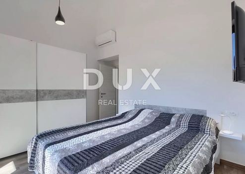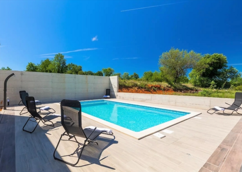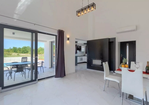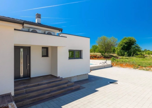 In der Nähe der Stadt Labin steht ein Haus mit einer Wohnfläche von 125 m² auf einem Grundstück von 759 m² zum Verkauf. Das neu gebaute einstöckige Haus besteht aus drei Schlafzimmern mit eigenem Bad, einer Toilette und einem geräumigen Wohn- und Esszimmer mit einer voll ausgestatteten Küche. Das Wohnzimmer mit Kamin ist dank der großen Glasflächen hell und luftig und hat direkten Zugang zur überdachten Terrasse. Das gesamte Haus ist klimatisiert und die erste Phase der Zentralheizung wurde installiert. Auf dem umzäunten und gepflegten Garten befindet sich ein 32 m² großer Swimmingpool mit Liegewiese und Parkplätzen.