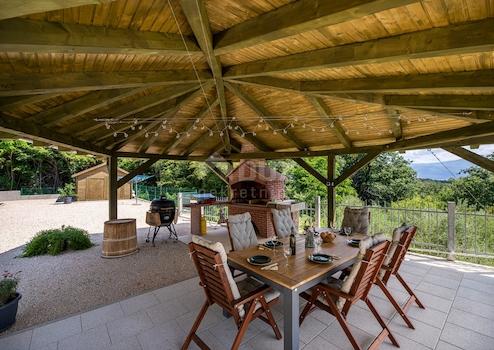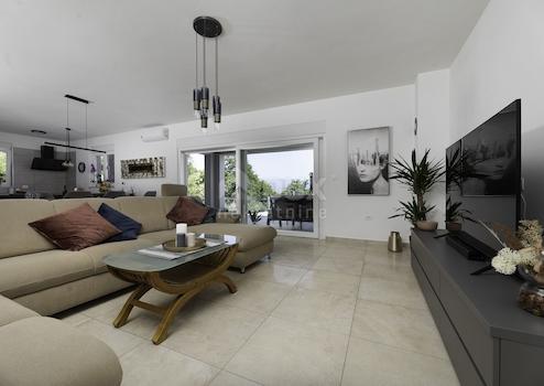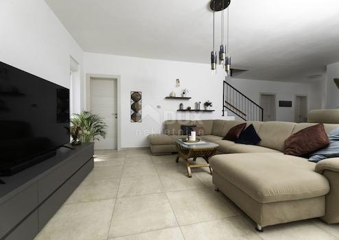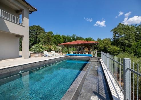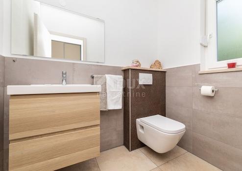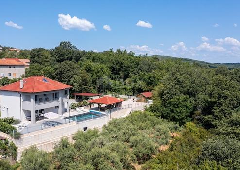 INSEL KRK, Gebiet VRBNIK - Freistehende Villa mit Pool und Panoramablick auf das Meer Diese schöne mediterrane Villa besteht aus Erdgeschoss und erster Etage und befindet sich an einem ruhigen Ort, letztes Haus in der Grünzone. Das Erdgeschoss verfügt über einen Heizraum, Speisekammer, WC, Wohnzimmer mit Küche und Essbereich mit Zugang zu einer überdachten Terrasse und einem Poolbereich mit Meerblick. Neben dem Pool gibt es eine nicht überdachte Terrasse und ein Sonnendeck sowie ein Gartenhaus mit einem Poolmaschinenraum und einem überdachten Bereich für eine Sommerküche und einen Grill. Im Obergeschoss befinden sich drei Schlafzimmer, drei Badezimmer und eine Terrasse mit wunderschönem Meerblick. Die Villa verfügt über einen zentralen Boiler, hochwertige italienische Keramik, elektrische Rollläden, hochwertige PVC-Fenster, Moskitonetze, Fußbodenheizung (Wärmepumpe), 5 Klimaanlagen, 10 cm dicke Fassade, hochwertige Keramik. Der Dachboden von 35 m2 ist als Fitnessraum eingerichtet. Im Hof gibt es zwei überdachte Parkplätze, alle Gärten haben automatische Bewässerung, der Pool ist 9 x 3,60 groß. Das Haus wird komplett möbliert und ausgestattet verkauft, die Küche ist von Nolte mit Bosch-Geräten. Das stärkste Kapital dieser Immobilie ist der Panoramablick auf das Meer, der bereits vom Erdgeschoss und vom Pool aus zu sehen ist.