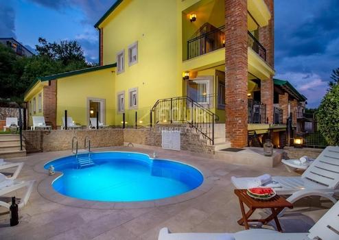 Wir bieten eine schöne Villa im mediterranen Stil mit Swimmingpool, Whirlpool, Gästehaus, Taverne und eingezäuntem Garten in der Stadt Brega oberhalb von Opatija, 2,5 km vom Meer entfernt.