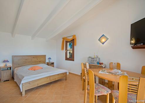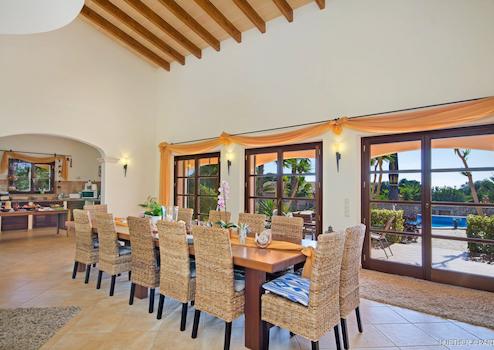 Die hohe Decke mit betonierten Balken in Holzoptik unterstreicht das luftige und mediterrane Raumgefühl. Die großen, bodentiefen Fenster bieten Zugang auf die überdachte Terrasse, die den perfekten Schattenplatz im Sommer bietet.