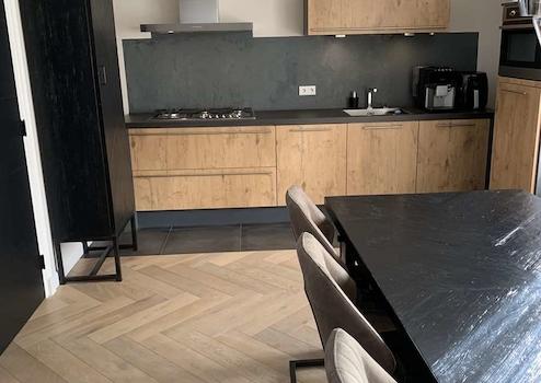 Bruynzeel keuken met vaatwasser, combi oven, koelkast, groot gasstel met afzuigkap.
