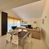 Die Wohnung im 1. Stock mit Galerie erstreckt sich über eine Fläche von 107 m2 und besteht aus einem Eingangsbereich, einem Badezimmer, einem Schlafzimmer, einer Küche mit Essbereich und einem geräumigen Wohnzimmer mit Zugang zu einem Balkon mit Meerblick.
