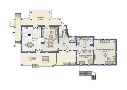 Das Erdgeschoss mit 367 m² verfügt über eine großzügige Küche mit Essbereich (65 m²), ein Wohnzimmer mit Holzofen (29 m²), einen separaten Entspannungsraum (31 m²), ein Arbeitszimmer, Waschküche, Trockenraum, ein Badezimmer, ein zusätzliches Badezimmer, ein separates WC sowie mehrere überdachte Terrassen und Außenbereiche mit Außenkamin und Grill.