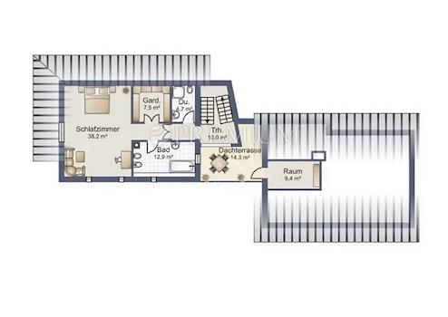 Über eine elegante Treppe gelangt man in das Obergeschoss mit Schlafzimmer, Ankleidezimmer, Badezimmer, überdachter Terrasse, separatem WC und Galerie, mit einer Gesamtfläche von 99,16 m². Der Grundriss kann bei Bedarf angepasst werden, um zusätzliche Schlafzimmer zu schaffen.