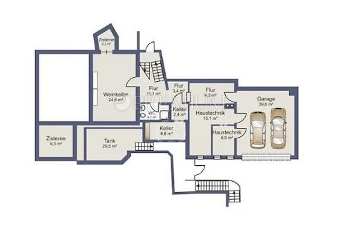 Das Untergeschoss mit einer Gesamtfläche von 171 m² umfasst eine 40 m² große Garage, eine traditionelle 25 m² große Konoba, zwei Abstellräume, einen Technikraum, eine Wasserzisterne, einen Tank, sanitäre Einrichtungen sowie zwei originale Steinzisternen.