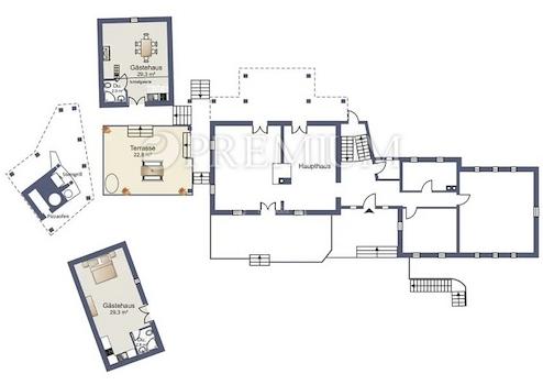 Zum Anwesen gehören außerdem, getrennt vom Hauptgebäude, zwei vollständig ausgestattete Steinhäuser für Gäste oder Personal sowie ein Pavillon/Aussichtspunkt mit Sommerküche und Steingrill.